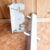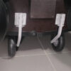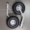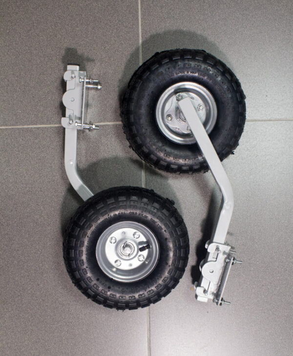 Данные колеса имеют съемную форму. Транец лодки просверливается насквозь. В отверстия вставляются крепежные болты, которые дополнительно закрепляются гайками, посаженными на герметик.Удобство заключается в том, что при спуске лодки на воду Вы можете снять колеса, и убрать их либо в машину, либо в сумку, либо оставить их на лодке.